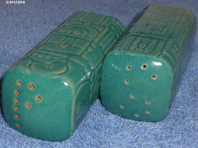 94H Myan-Aztecs, turquoise green glaze. S9/P9 holes set, crude "S" group. Some of the very first 7H shakers have hole sets squared to the shakers. This glaze is thought by some to be a 1953 glaze, but I believe these to be from 1942.
