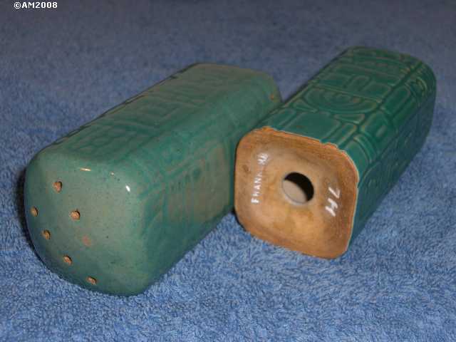 7H Myan-Aztecs, truquoise green glaze. S7/P9, crude "S" group. Base is inscribed “7H” on both. The salt is additionally incised with the small Frankoma mark with oval “o” (highlighted with talc). This mark measures 19 mm whereas the standard mark measure 25 mm. Probably one of the very first example of this issue.