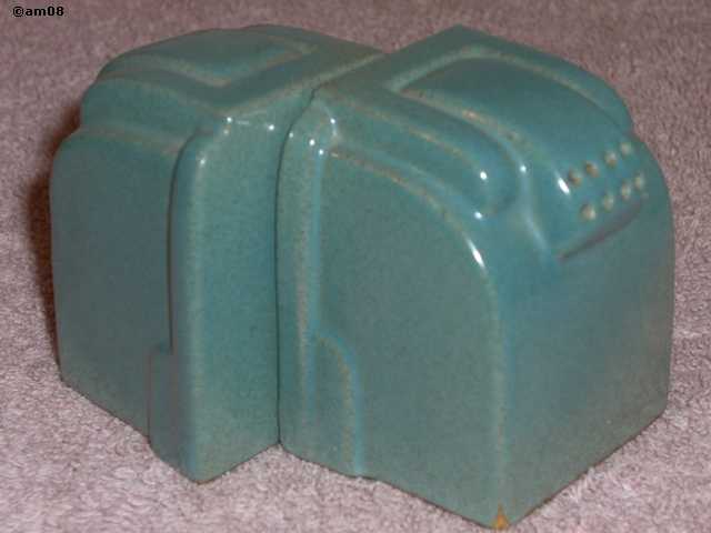#45 Moderns, blue-gray jade, 8/8 hole set, small impressed round “o” on both pieces. Probable production 1936-1937. The blue colors on these early shakers are difficult to tell apart.