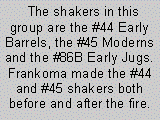 The #44 Tabbed Barrels and the #45 Moderns were the first salt and pepper shakers issued by Frankoma. They were soon followed by the #86B Jugs. Dinnerware sets were still in the future (Wagonwheels, 1941) but utilitarian pieces were being made with these among them.