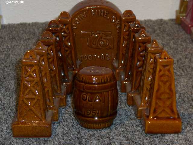No wonder collectors have trouble sorting out the brown glazes! The two pair of Derricks in front are Osage brown. Osage has tiny dark spots throughout giving it a grainy look. The third and fourth pair of Derricks are sorghum brown as is the barrel shaker in the middle. I used the barrel shaker because it has the date right on it. This is a smooth glaze with no little spots. The glaze on the 94HLD Horseshoe shaker in the rear is coffee. It is easily identified because of its much later date, but just based on color coffee is very similar to the sorghum glaze.