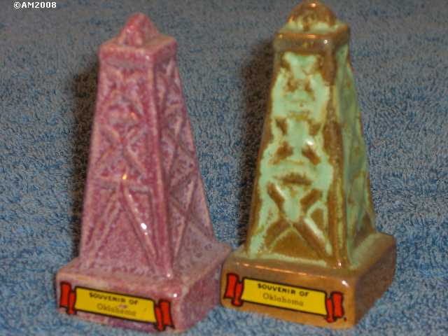 49H Oil Derricks, redbud and prairie green glaze, 3/3 holes set. This Type 2 set is marked "Souvenir of Oklahoma". Sets with two glazes are fairly common. I am not sure whether the switch occured at the factory or at the gift shop.