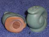 Frankoma produced the #558H snail shakers for several years and as a result they are fairly easy to find.  The prairie green ones are common and a wide variety of glazes is available.  Apparently because they are not as lovable as the cats, bulls, and elephants the snail shakers are relatively inexpensive. Because of the small size these shakers are usually not marked, but the onyx pair and the sky blue pair shown below have the impressed Frankoma with oval “o” mark.