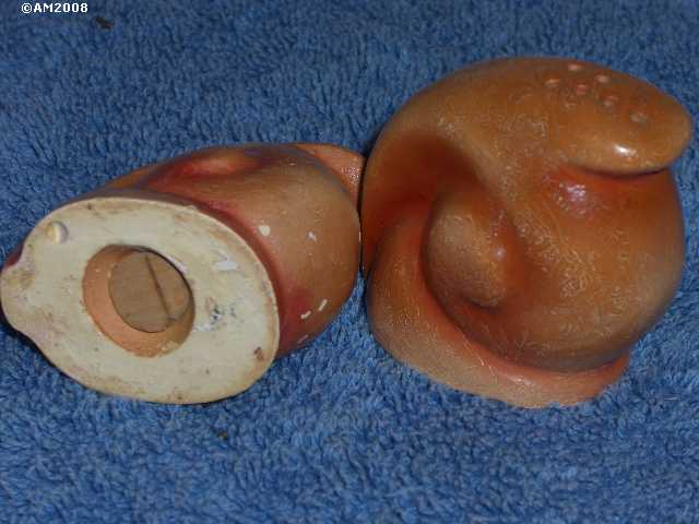 558 Snail Fakes. These are made of chalk from the Type 1 mold. The finish is spray painted. The cavity and pour holes are drilled. To my knowledge the Snails, Bulls, and Elephants were faked this way. Made in the early post-fire period as confirmed by the hole set.