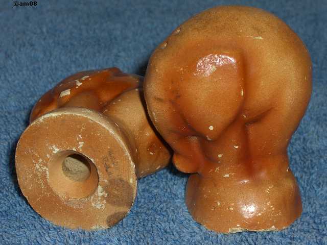 160H Elephants. This pair is a chalk copy of the real thing. The interior cavity is drilled and the color is sprayed on. Otherwise these are an accurate copy of the real thing. One of these even has the detail of an ink stamp "Made in USA"! This dates the fakes to the 1942 period when the ink stamp was in use. I have a single bull and a pair of snails made the same way.
