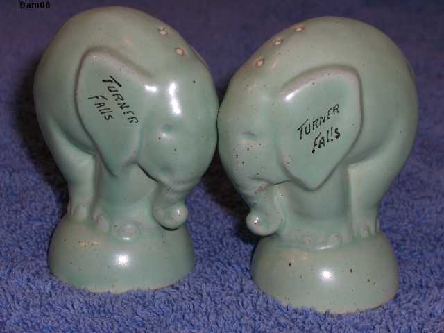 160H, Elephants, silver sage glaze, 3/2 hole set. Impressed oval “o” on both. These are marked “Turner Falls” by hand on the ear of each. This "Turner Falls" hand applied sourvenir marking is common on Frankoma shakers from the early 1940's.