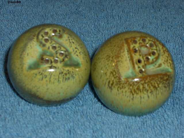 40H Cannonballs, prairie green glaze, S7/P8 hole set, no base marks. It is unusual to have more holes for pepper than salt!.