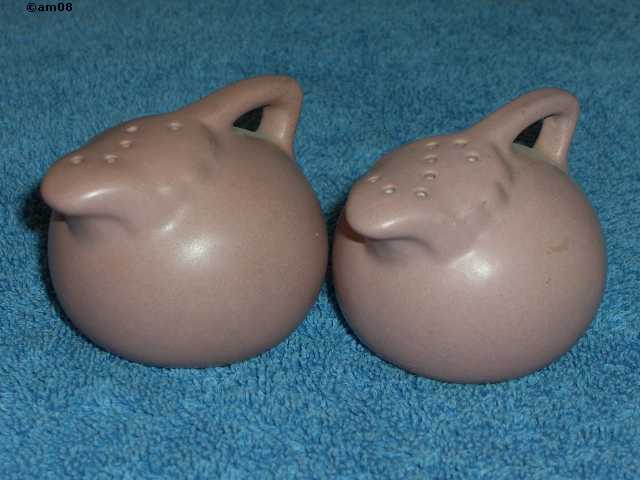 87H Balls, dusty rose glaze, S5/S8 hole set, no base marks. Clearly not a set as the “S” pour holes have a different pattern. Glaze and pattern rarities such as this often show up both salts or peppers. The occurence is frequent enough that I think some times Frankoma just made one side of a set and sold them that way.