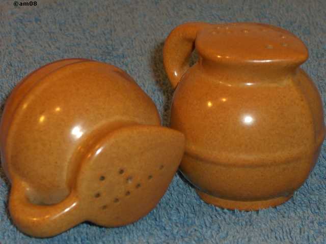 93H Guernseys, fawn glaze, S9/P10 hole pattern, no marks. The salt holes are large and the pepper holes are small. This hole pattern is common in the Guernseys but rare in other issues.