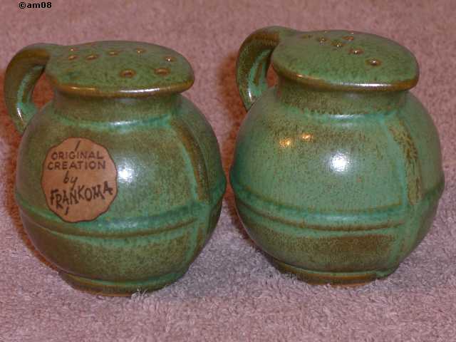 93H Guernseys, prairie green glaze, S9/P8 hole pattern, no base marks. Salt bears “original creation” paper label. This label is fairly common on post-1938 shakers.